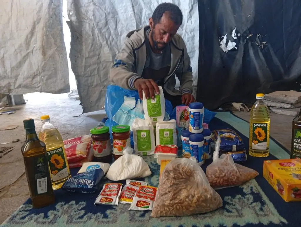 De utdelade ramadanpaketen har satts samman av basvaror som kan täcka familjernas dagliga näringsbehov. De innehåller bland annat mejeriprodukter som vitost, samt konserverade tomater, sylt, socker och te. Därtill ingår oumbärliga köksvaror såsom olivolja och matolja, tahini, ris, pasta och salt.